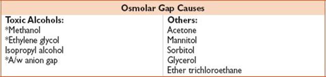Osmolar gap: Measured serum Osm – Calculated Osm >10 mOsm/L, where