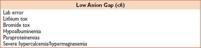 Note: Needs to be corrected for albumin; a fall in serum albumin 1 g/dL from the nl value (4.2 g/dL) decreases the anion gap by 2.5 meq/L. Corrected AG = AG + (2.5 × [4.2 – albumin]).