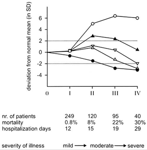 FIGURE 11D.1. Serum thyroid hormone concentrations (filled circle, triiodothyronine (T3); open circle, reverse T3 (rT3); open triangle, thyroxine (T4); upside down open triangle, free T4 index; closed triangle, free T4, measured by equilibrium dialysis) in 504 newly hospitalized patients, divided as follows: group I, all values within the normal reference range; group II, serum rT3 values high but serum T3 and T4 values normal; group III, serum T3 values low but serum T4 values normal; group IV, serum T3 and T4 values low. The hospitalization days are given as median days for the survivors. (From Docter R, Krenning EP, de Jong M, et al. The sick euthyroid syndrome: changes in thyroid hormone serum parameters and hormone metabolism. Clin Endocrinol (Oxf) 1993;39:499, with permission.)