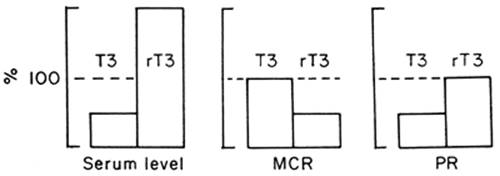 FIGURE 11D.2. Effect of nonthyroidal illness on serum concentrations, metabolic clearance rate (MCR), and production rate (PR) of triiodothyronine (T3) and reverse T3 (rT3; expressed as a percentage of the values in normal subjects). (From Doctor R, Krenning EP, de Jong M, et al. The sick euthyroid syndrome: changes in thyroid hormone serum parameters and hormone metabolism. Clin Endocrinol (Oxf) 1993;39:499, with permission.)