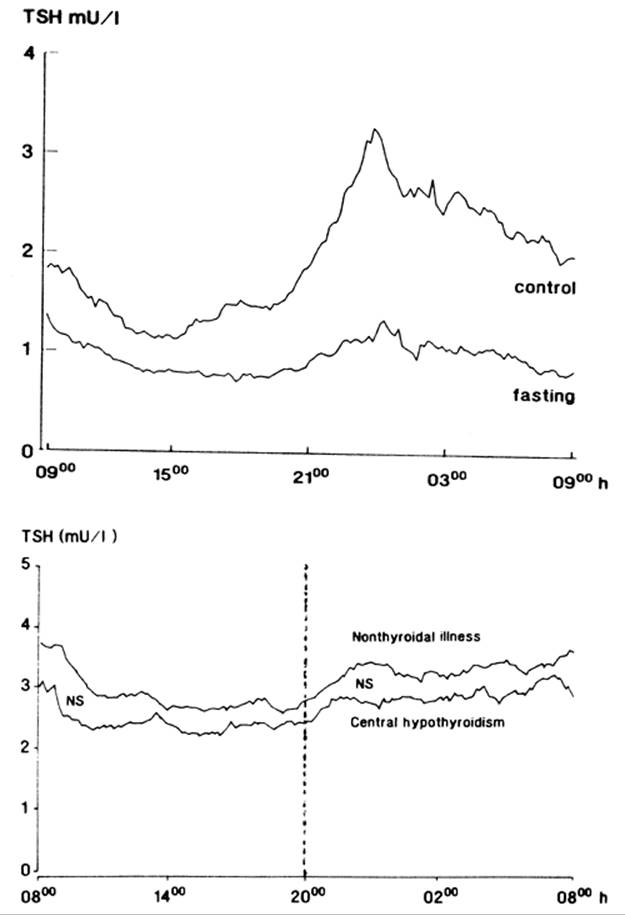 The failure of serum TSH concentrations to increase despite marked reductions in serum T3 and sometimes T4 concentrations, as occur in patients with thyroid disease, suggests that the sensitivity of TSH secretion to low serum thyroid hormone concentrations is decreased in patients with nonthyroidal illness. This could be due to changes in the thyrotrophs or to decreased TRH secretion. Evidence for the latter is a decrease in the amplitude (but not frequency) of the nocturnal pulses of TSH secretion; such decreases in pulse amplitude have been documented during fasting (22), after surgery (23), and in a wide variety of nonthyroidal diseases, including chronic renal insufficiency, diabetes mellitus, acute respiratory failure, infections, cancer, and critical illness (24,25,26,27,28). For example, fasting for 60 hours results in disappearance in the nocturnal surge in TSH secretion and a 50% reduction in 24-hour mean serum TSH concentrations (Fig. 11D.3), as well as decreases in serum T3 and increases in serum rT3 concentrations (22). Among patients with nonthyroidal illnesses, the nocturnal surge in TSH secretion is decreased in at least half, and the decrease is not closely related to changes in serum T3 or free T4concentrations (26). The pattern of 24-hour TSH secretion in these patients, therefore, is similar to that in many patients with central hypothyroidism (Fig. 11D.3) (29). If the abnormal pattern of TSH secretion persists for a week or longer in patients with nonthyroidal illness, then their T4 production rate should decrease, as it does in patients with central hypothyroidism.