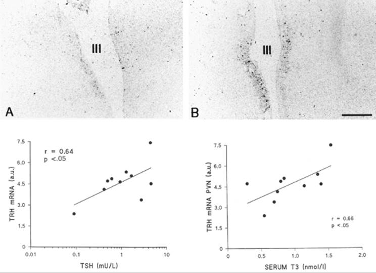 In a study of premortem serum thyroid hormone concentrations and postmortem hypothalamic TRH gene expression in patients with nonthyroidal illness, the TRH messenger RNA (mRNA) content in the paraventricular nucleus was positively correlated with serum T3 and TSH concentrations, but not with serum T4 or free T4 concentrations (Fig. 11D.4) (30). In another study, the T3 content of the hypothalamus and anterior pituitary were, respectively, 64% and 46% lower in patients who died as a result of nonthyroidal illness, as compared with patients who died suddenly (31). Furthermore, the TSH that is secreted in patients with nonthyroidal illness is less glycosylated, and therefore less biologically active, than normal, a change that also occurs in patients with overt hypothalamic disease and TRH deficiency (32,33).