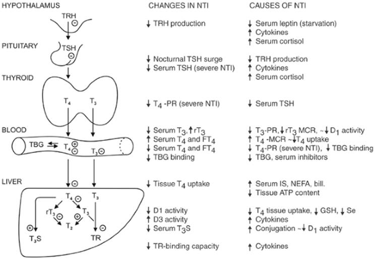 58. Vos RA, Jong M de, Bernard BF, et al. Impaired thyroxine and 3,5,3′-triiodothyronine handling by rat hepatocytes in the presence of serum of patients with nonthyroidal illness. J Clin Endocrinol Metab 1995;80:2364.