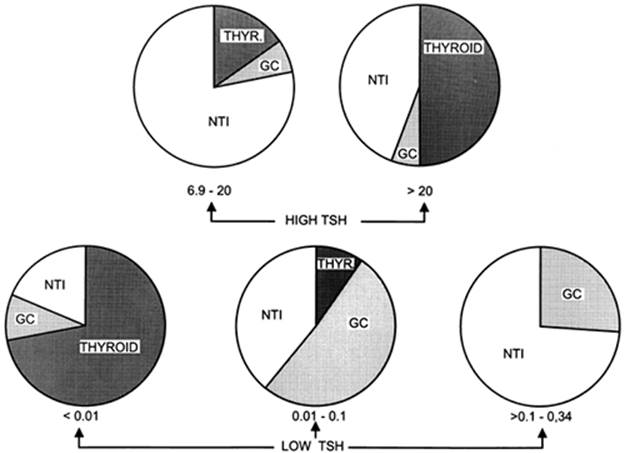 FIGURE 11D.7. The proportion of patients with thyroid disease (Thyr. or Thyroid), nonthyroidal illness (NTI), and receiving glucocorticoid therapy (GC) among a large group of hospitalized patients, subdivided according to five ranges of serum thyrotropin TSH concentrations. (From Stockigt JR. Guidelines for diagnosis and monitoring of thyroid disease: nonthyroidal illness. Clin Chem 1996;42:188, modified with permission; and Spencer CA. Clinical utility and cost-effectiveness of sensitive thyrotropin assays in ambulatory and hospitalized patients. Mayo Clin Proc 1988;63:1214, with permission.)
