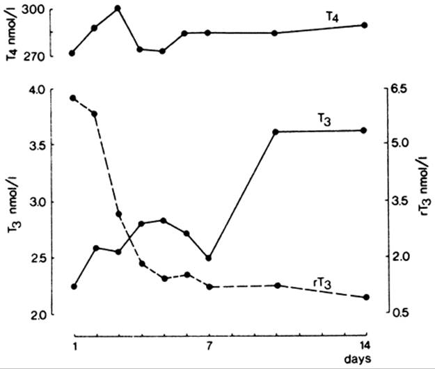 A fall in serum triiodothyronine (T3) concentrations and a rise in serum reverse triiodothyronine (rT3) concentrations are the most common changes in patients with nonthyroidal illness, which is often referred to as the low T3 syndrome. Fasting induces these changes in serum T3 and rT3 concentrations within 24 to 36 hours, and the values return rapidly to baseline upon refeeding. The composition of the food is relevant: refeeding with glucose is more effective in restoring normal values than refeeding with equicaloric amounts of protein or fat (4). Similarly, serum T3 concentrations fall and serum rT3 concentrations rise within a few hours after initiation of general anesthesia and surgery, and return to normal in several days if the postoperative course is uncomplicated.