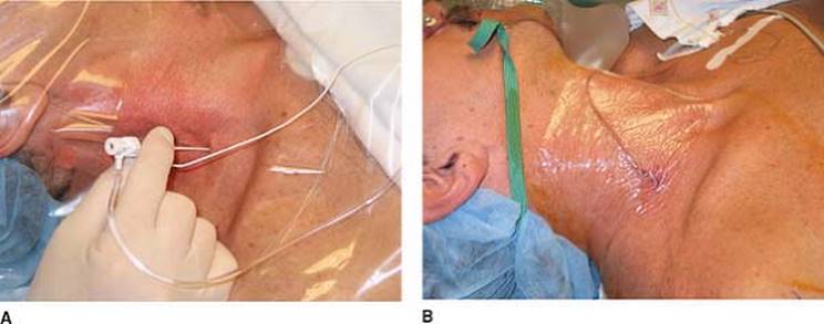 After the injection, the catheter is tunneled posteriorly (Fig. 26-7B). The catheter is secured in place with Steri-Strip and covered with a transparent dressing.
