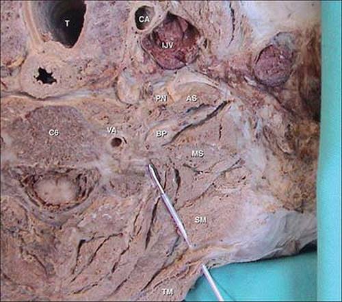 Anatomic Landmarks: The brachial plexus (BP), the anterior (AS) and middle (MS) scalene muscles, the vertebral artery (VA) guarded by the bony structures of the vertebrae, the trapezius muscle (TM) and levator scapulae muscles (SM), the phrenic nerve (PN), the internal jugular vein (IJV), the carotid artery (CA), and the trachea (T) (Fig. 26-4).