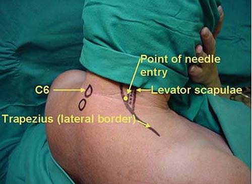 Approach and Technique: With the head and neck rotated to the opposite side, the patient is asked to lift the head slightly off the bed (contracting and accentuating the SCM muscle). The lateral border of the SCM muscle is identified and marked. Next, two fingers are placed on the posterior edge of the muscle, and the patient is asked to relax the neck.