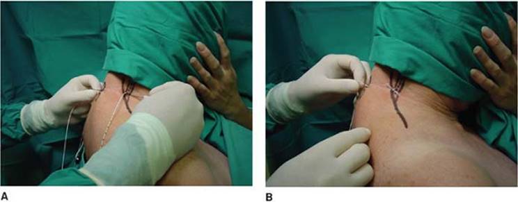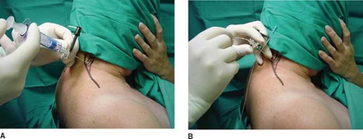 Figure 26-7. A: The local anesthetic solution is injected slowly with repeat negative blood aspiration every 5 mL. B: The catheter is tunneled posteriorly. |
