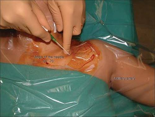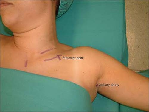 Approach and Technique: The whole length of the clavicle is marked after palpation. A skin wheal is raised 1 cm caudal below the inferior border of the clavicle at its central point. The needle is directed laterally between 45° and 60° to the skin toward the emergence of the axillary artery in the fossa axillary as close as possible to the lateral border of the pectoralis major muscle.