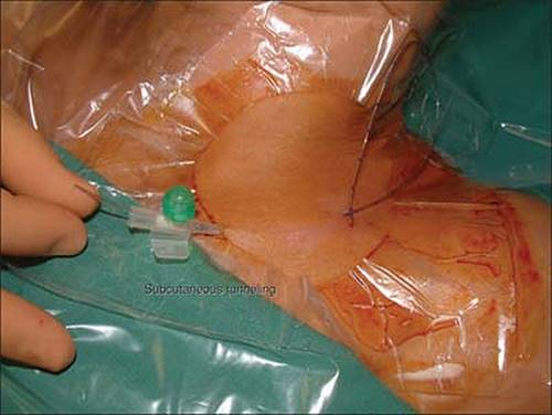 Figure 26-12. Disinfect the point of the puncture and the exit of the tunnel with antiseptic and fix the catheter with moisture-responsive cannula dressing. |