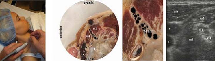 Ultrasonographic Landmarks: The sternocleidomastoid muscle lies superficial to the anterior and middle scalene muscles (Fig. 33-1). The nerve plexus is sandwiched between the scalene muscles. The carotid artery and internal jugular vein lie deep to the sternocleidomastoid muscle and medial to the brachial plexus at this level. In some patients, the vagus nerve may be seen between the carotid and jugular vein and the phrenic nerve may be seen lateral to the carotid artery and jugular vein as it courses over the anterior scalene muscle.