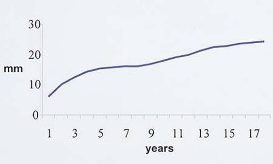 Skin–Nerve Distance: 0.6 cm (5 mm) at the age of 1 year, 2.5 cm (5 mm) at the age of 18 years (Fig. 57-1).