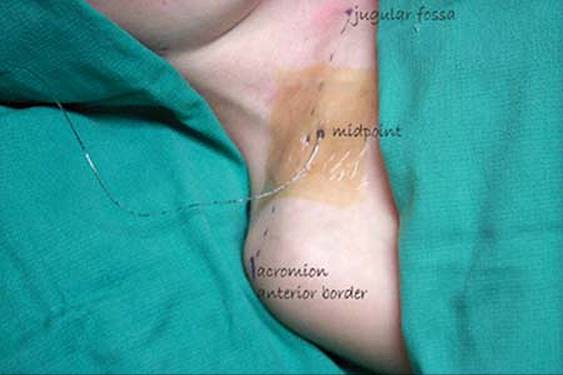 Anatomic Landmarks: The lateral border of the sternocleidomastoid muscle is identified and marked. Posteriorly, the groove between the anterior and the middle scalene muscle is identified. Next, a line is drawn at the level of the cricoid cartilage. At the intersection of these two lines, the brachial plexus will be found in the interscalene groove.