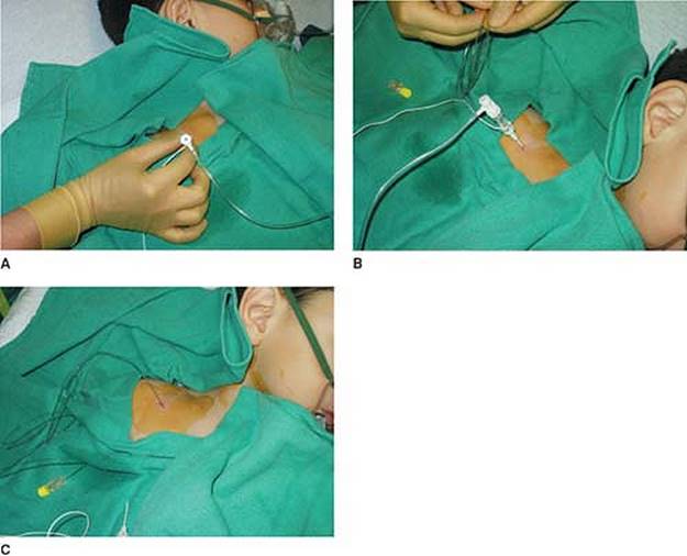 Approach and Technique: The insertion point should be high in the interscalene groove. In an appropriately anesthetized/sedated child, the insulated introducer Tuohy needle, connected to a nerve stimulator (1.5 mA, 2 Hz, 0.1 ms), is positioned parallel to the neck, close to the external jugular vein and directed anteriorly to the interscalene groove. After appropriate positioning of the needle to maintain the muscle response with a current of 0.5 mA, the local anesthetic solution is slowly injected after negative aspiration for blood. Maintaining the insulated introducer needle in the same position, the catheter is threaded 2 cm beyond the needle tip. The Tuohy needle is removed, and the catheter is secured in place with Steri-Strip (3M, St. Paul, MN) and covered with a transparent dressing (Fig. 57-2).