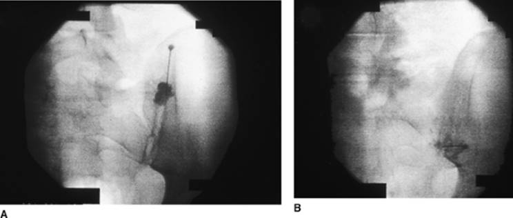 Approach and Technique: After sterile preparation of the region, the sacroiliac joint is identified under fluoroscopy in the anteroposterior view (Fig. 70-1A). To gain access to this joint space, the fluoroscopic beam must be rotated approximately 15° to 30° to the opposite side of the joint to locate the posterior face of the sacroiliac joint, and then 20° to 30° cephalad and caudad (Ferguson view; Fig. 70-1B). Two separate injections can be performed. The first injection is aimed at the inferior one-third of the joint. Accordingly, the 22-gauge spinal needle is aimed in the same direction as the fluoroscopic beam to gain access to the joint. A loss of resistance is often felt as the joint space is entered. Next, the superior one-third of the joint space is entered in a similar fashion. To help confirm the joint space location, 0.5 to 1.0 mL of contrast dye can be injected prior to the injection of the local anesthetic mixture.