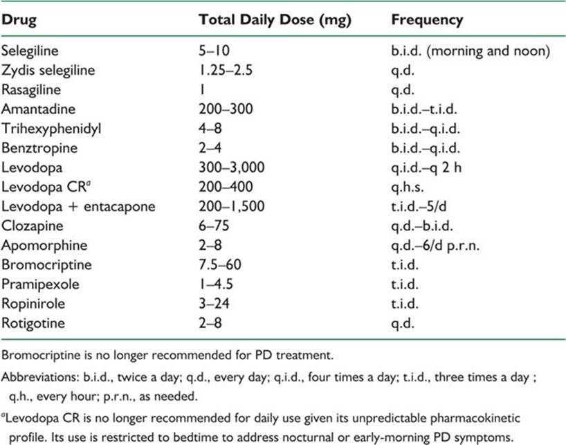 Dopamine receptor agonists may relieve all of the cardinal manifestations of PD. Despite the theoretical advantages over levodopa by acting directly on striatal dopamine receptors while circumventing the degenerating dopaminergic neurons, dopamine agonists are less effective than levodopa, yielding a lower risk of dyskinesia and motor fluctuation compared with it, and have an extensive list of potential side effects. Agonists can be used both as monotherapy and as adjuncts to levodopa. To minimize side effects, the dosage of a dopamine agonist should be increased gradually until the desired effect is obtained. Table 41.1 shows common dosages for different antiparkinsonian drugs. Apomorphine can only be administered subcutaneously as a rescue treatment for intractable and disabling wearing off. An apomorphine challenge is required to determine the correct dose of the drug while the patient is pretreated with an antiemetic, such as domperidone or trimethobenzamide.