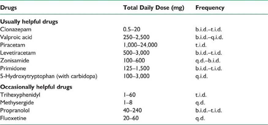 2. The ideal therapy for myoclonus is to manage the underlying condition. However, symptomatic treatment should be used if treatment is likely to make a significant functional impact (Table 41.2). Clonazepam at 2 to 6 mg per day, valproic acid 250 to 1,500 mg per day, levetiracetam (Keppra; UCB) 500 to 4,000 mg per day, and piracetam up to 24 g per day (not available in the United States) are first-line drugs for the management of myoclonus. Acetazolamide, zonisamide, primidone, 5-hydroxytryptophan, and tetrabenazine can also be helpful. Many patients need polytherapy to control myoclonus.