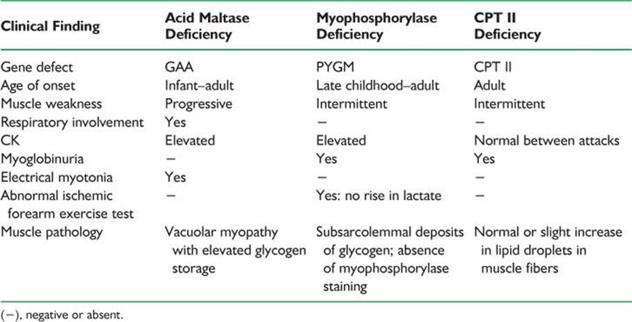 Metabolic myopathies comprise a group of inherited disorders in which the defect is an alteration in the processing of carbohydrates or fats. Acid maltase deficiency, McArdle’s disease, and carnitine-O-palmitoyltransferase (CPT II) deficiency are reviewed (Table 47.2).