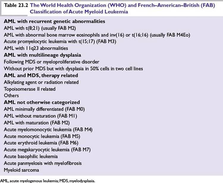 There are two current systems to classify AML. The most commonly used criterion is from the World Health Organization (WHO) and incorporates recurrent cytogenetic abnormalities and prognostic groups (Table 23.2). Marrow blasts should make up 20% of the nucleated cells within the aspirate unless t(8;21) or inv(16) is present. The FAB classification is also used and classifies AML into eight subtypes. The blasts may be characterized as myeloid lineage by the presence of Auer rods; a positive myeloperoxidase, Sudan black, or nonspecific esterase stain; and the immunophenotype shown by flow cytometry. Cell surface markers associated with myeloid cell lines include CD13, CD33, CD34, c-kit, and HLA-DR. Monocytic markers include CD64, CD11b, and CD14. CD41 (platelet glycophorin) is associated with megakaryocytic leukemia, and glycophorin A is present on erythroblasts. HLA-DR–negative blast phenotype is commonly seen in APL and serves as a rapidly available test in confirming the suspicion of this subtype requiring a specific induction therapy.