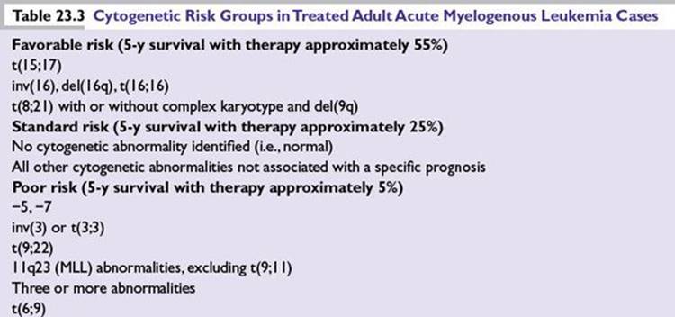 Those patients who are older (>60 years) and those with an elevated blast count at diagnosis (>20,000) have a worse prognosis. Chemotherapy-related AML and prior history of myelodysplasia (MDS) impart a lower chance of obtaining complete remission (CR) and long-term survival. Table 23.3 illustrates the prognostic groups according to cytogenetics.