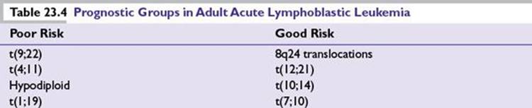 As in AML, patients with ALL have a worse prognosis when presenting with advanced age or elevated WBC count. Burkitt-cell (mature B-cell) leukemia or lymphoma has an improved prognosis with intensive chemotherapy and CNS treatment; it usually has a translocation involving chromosome 8q24. Table 23.4 lists the prognostic groups according to cytogenetic analysis. The presence of t(9;22) (Philadelphia chromosome) is the most common abnormality in adults. It is present in 20% to 30% of patients with ALL and in up to 50% of patients in the B-cell lineage. Long-term survival is dismal in this group if treated by chemotherapy alone, and patients are recommended to undergo allogeneic transplantation if they are a suitable candidate in first CR.