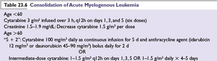 The consolidation options for those patients who enter CR are shown in Table 23.6. HDAC especially may benefit those patients with good-risk disease [t(8;21) or inv(16)]. These good-risk patients should not receive transplantation in CR1. Consolidation usually consists of four cycles (the minimum effective dose and number of cycles are not clear). Older patients do not seem to benefit from more than one to two consolidation cycles. Patients with preceding MDS or poor-risk cytogenetics should receive an allogeneic transplantation, if possible. Patients with standard-risk cytogenetics should be considered for an allogeneic transplant, especially if they have a matched sibling donor. Gene mutations may assist in the proper identification of standard-risk patients who would benefit from allogeneic transplant in CR1 (see the Allogeneic Transplant section).