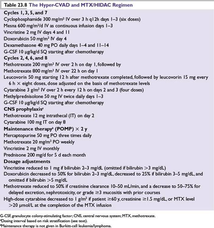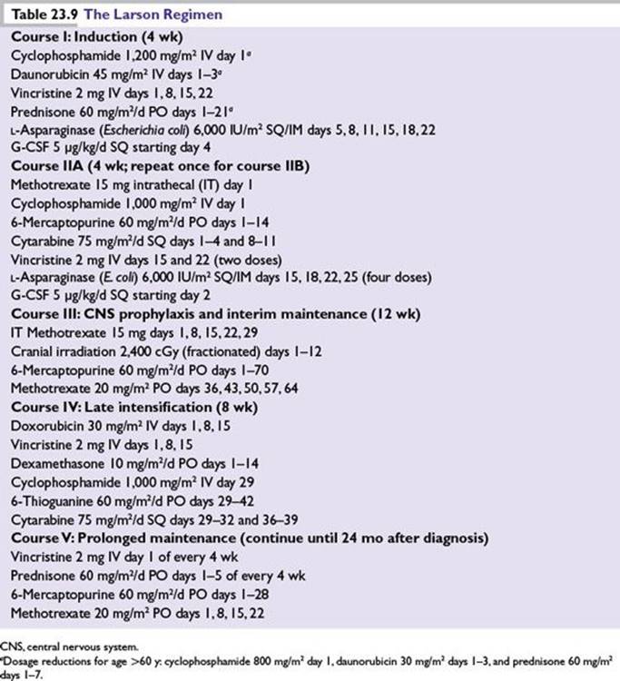 Several strategies exist for the treatment of adult ALL. Table 23.8 illustrates the hyper-CVAD (cyclophosphamide, vincristine, doxorubicin, and dexamethasone) regimen employed in many North American centers. The Larson regimen reported by Cancer and Leukemia Group B (CALGB) Study 9111, shown in Table 23.9, is also commonly employed. Other options based on the Hoelzer and Linker regimen are also available. Burkitt-cell leukemia (mature-B ALL, L3) can be treated with hyper-CVAD without maintenance therapy but requires aggressive CNS treatment to prevent relapse. Adolescent and young adult patients (age ≤40) with ALL should be treated with pediatric regimens.
