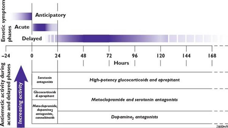 •If antineoplastic treatment is associated with delayed emetic symptoms, continue antiemetic prophylaxis:
