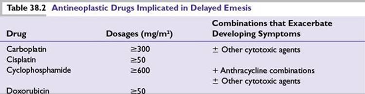 Delayed-phase symptoms are defined as those that occur >24 hours after treatment (Table 38.1) and are associated with central activation of neurokinin type 1 (NK1) receptors, for which substance P is the natural ligand. Drugs with high emetogenic potential and, in some cases, drugs with moderate emetic risk may cause delayed-phase symptoms (Table 38.2). Symptoms may occur as early as 16 to 18 hours after emetogenic treatment, with a period of greatest incidence between 24 and 96 hours after treatment. Delayed emesis may occur in patients who do not experience symptoms acutely, but incidence characteristically decreases in patients who achieve complete control during the acute phase. Although emesis is typically less severe during the delayed phase than during the acute phase, the reported severity of nausea is similar during both phases.