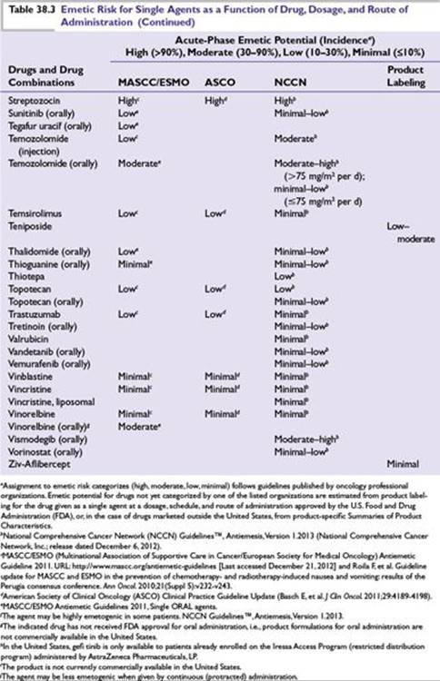 Figure 38.2 integrates evidence-based guidelines for treatment-appropriate antiemetic prophylaxis recommended by the National Comprehensive Cancer Network, the Multinational Association of Supportive Care in Cancer and European Society for Medical Oncology, the American Society of Clinical Oncology, and the consensus of experts in oncology. Recommendations are based on assessment of emetic risk and generally apply to adult patients, but may not be appropriate in all clinical situations. Drug selection and utilization should be tempered by professional judgment, including an assessment of patient-specific risk factors and circumstances, and recognition of available resources.