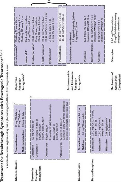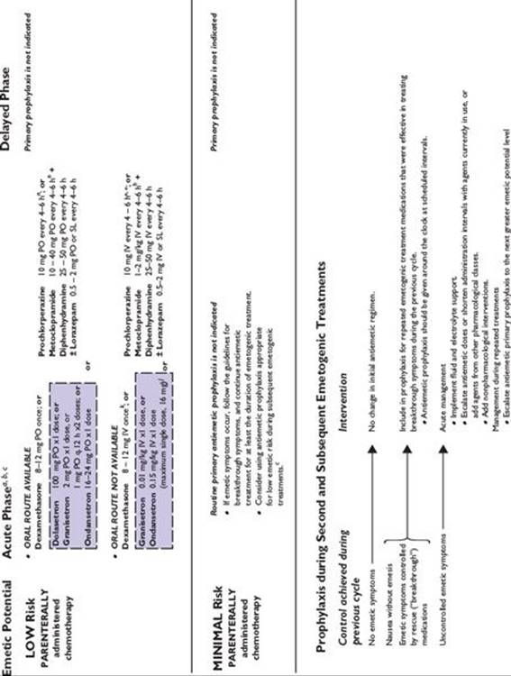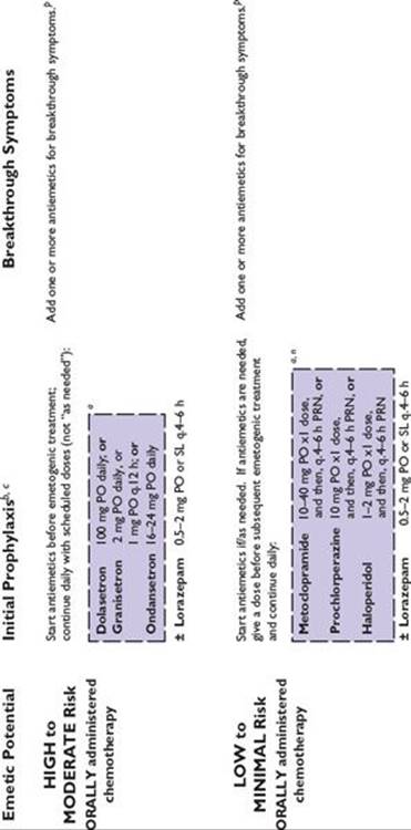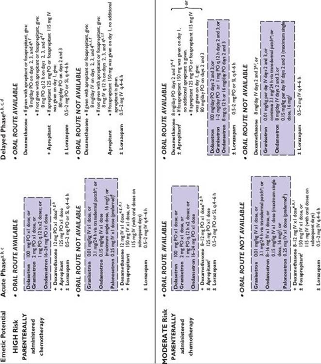 FIGURE 38.2 Algorithms for antiemetic prophylaxis and treatment for parenterally and orally administered emetogenic drugs. 5-HT3, serotonin (5-HT3 subtype); ASCO, American Society of Clinical Oncology; D2, dopamine (D2 subtype); IM, intramuscular; IV, intravenous; MASCC/ESMO, Multinational Association of Supportive Care in Cancer/European Society for Medical Oncology; NCCN, National Comprehensive Cancer Network®; PO, oral; PR, rectal; RT, radiation therapy; SL, sublingual. aMedications are not listed in order of preference except where indicated. Pharmacologically similar alternatives are circumscribed by a broken line. bOral prophylaxis should begin 1 hour before commencing cytotoxic treatment. IV prophylaxis may be given minutes before emetogenic treatment. cAntiemetic prophylaxis should be repeated each day emetogenic treatment is administered. dDelayed-phase prophylaxis may begin 12 to 24 hours after the start of emetogenic treatment. eConsider administering a histamine (H2 subtype) receptor antagonist (other than cimetidine) or a proton pump inhibitor concurrently with dexamethasone to prevent GI irritation. f The recommended schedule for dexamethasone is twice daily if used without aprepitant and once daily if used with aprepitant. gIncrease dexamethasone dose to 20 mg if it is given without aprepitant or fosaprepitant. hDexamethasone 12 mg is the only dexamethasone dose tested in combination with aprepitant in large randomized trials. i When administered IV, dexamethasone should be given as a short infusion over 10 to 15 minutes to prevent uncomfortable sensations of warmth. jProduct labeling for ondansetron approved by the FDA recommends single intravenously administered doses should not exceed 16 mg. kMASCC/ESMO guidelines recommend combination antiemetic prophylaxis with dexamethasone and palonosetron for all chemotherapy with moderate emetic risk, including chemotherapy regimens containing an anthracycline and cyclophosphamide (an “AC” regimen) when an NK1 receptor antagonist cannot be used in combination with dexamethasone and a 5-HT3 receptor antagonist. NCCN Guidelines® recommend palonosetron as the preferred 5-HT3 receptor antagonist antiemetic in combination with dexamethasone for antiemetic prophylaxis for patients who receive intravenous chemotherapy with high or moderate emetogenic risk. l NCCN Guidelines recommend adding aprepitant in primary antiemetic prophylaxis for selected antineoplastics when those medications are given at dosages associated with moderate emetogenic risk, including carboplatin, cisplatin, doxorubicin, epirubicin, ifosfamide, irinotecan, or methotrexate. mGranisetron Transdermal System (Sancuso®; ProStraken Inc., Bedminster, NJ), an adhesive-backed patch, contains 34.3 mg granisetron and delivers an average daily dose of 3.1 mg. nGenerally, regimens containing D2 receptor antagonists and metoclopramide doses ≥20 mg should include primary prophylaxis with anticholinergic agents against acute dystonic extrapyramidal reactions, for example, diphenhydramine 25 to 50 mg PO or IV every 6 hours. Benztropine and trihexyphenidyl are alternatives. Parenteral administration is preferred for prompt treatment of extrapyramidal symptoms, as well as interrupting or discontinuing the drug which provoked the adverse reaction. oWhen administered IV, phenothiazines should be given over 30 minutes to prevent hypotension. pMedications identified for breakthrough symptoms should be added to a patient’s primary antiemetic prophylaxis regimen without replacing drugs used in primary prophylaxis unless drugs used to treat breakthrough symptoms duplicate mechanistically those used in primary prophylaxis or a patient has experienced unacceptable adverse effects attributable to a component of primary prophylaxis. qContinue for at least 24 hours after completion of radiation treatment. rASCO guideline update (2011) identifies granisetron and ondansetron as the 5-HT3 receptor antagonists preferred in prophylaxis against radiation-induced emetic symptoms.