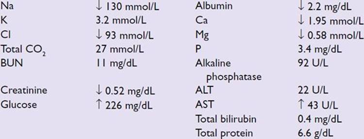 2.At presentation in clinic, the same patient’s height and weight are measured. Her height is 170.2 cm (67˝); current weight is 110 kg (243 lb). A pretreatment analysis of serum chemistries revealed the following (results outside of normal ranges identified by up and down arrows):