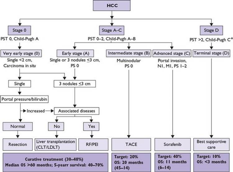FIGURE 7.1 Barcelona Clinic Liver Cancer (BCLC) HCC staging classification. The classification includes an algorithmic treatment recommendation and outlines the approximate percentage of patients likely diagnosed within each stage in a Western population, as well as their estimated survival with the relevant treatment modalities. HCC, hepatocellular carcinoma; PST, ECOG performance status; CLT, cadaveric liver transplantation; LDLT, living donor liver transplantation; RF, radiofrequency ablation; PEI, percutaneous ethanol injection; TACE, transarterial chemoembolization; OS, overall survival. (Adapted from Bruix J, Sherman M. Management of hepatocellular carcinoma. Hepatology. 2005;42(5):1208-1236. With permission of John Wiley and Sons, Inc.)