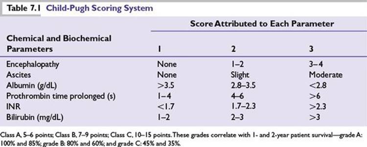■The Child-Pugh grading system has been incorporated into the management of HCC because it evaluates the status of the underlying liver function and influences treatment (Table 7.1).