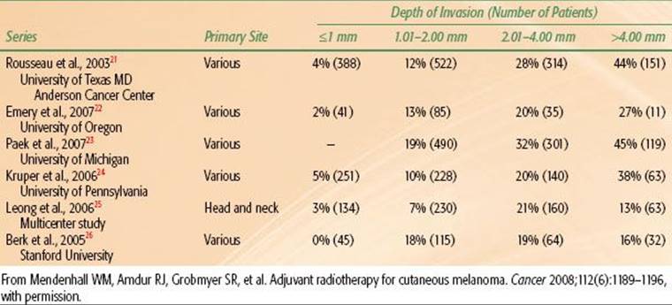 One of the largest experiences with adjuvant RT for melanoma has been reported by investigators from the MD Anderson Cancer Center (Houston, TX; Table 33.14). Although RT may be used to treat gross disease, this would only occur by default and in mostly palliative situations.