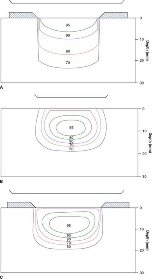 FIGURE 33.1. A: 250-kVp x-rays (HVL 1.4 mm Cu) with secondary collimation on the phantom surface. Source-to-surface distance (SSD) = 50 cm; isodose %: 95, 90, 80, 70. B: 6-MeV electron beam with secondary collimation 5 cm above the phantom surface (at the level of the electron cone). Source of collimator distance (SCD) = 95 cm; SSD = 100 cm; isodose %: 95, 90, 80, 70, 50. C: 6-MeV electron beam with tertiary collimation on the phantom surface. SSD = 100 cm; SCD = 100 cm; isodose %: 95, 90, 80, 70, 50.