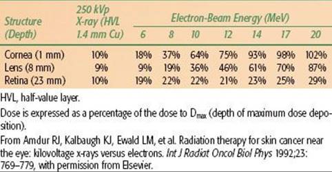 Before treatment with either electron-beam or orthovoltage x-rays, a customized lead mask is constructed to collimate the beam directly on the skin surface. A 1.0- to 1.5-cm margin is adequate for a well-defined T1 lesion treated with orthovoltage RT. An additional 1 cm is added to the margin when the electron beam is used to account for beam constriction. For larger and/or ill-defined tumors, a 2-cm margin is usually necessary. If the tumor is located near the eye, a gold-plated lead eye shield is placed directly on the anesthetized cornea to minimize the irradiation dose to underlying structures (Fig. 33.2). The dose beneath the eye shield is depicted for orthovoltage x-rays and electron beams of various energies in Table 33.4. Isodose distributions for the two techniques are shown in Figure 33.1; note that the dose distribution is better for orthovoltage RT than for electron beam, particularly if a lead mask is not used with the electron beam.