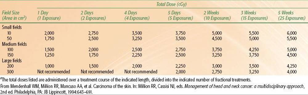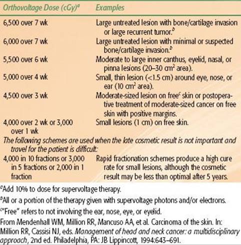 Dose-fractionation schedules used for irradiation of skin cancers are outlined in Table 33.5. We have recently used twice-daily RT with megavoltage photons or protons at 1.2 Gy per fraction to doses of 74.4 Gy in a continuous course with a minimum 6-hour interfraction interval for advanced lesions near radiosensitive structures. The suggested maximum doses for short-course orthovoltage RT are listed in Table 33.6.