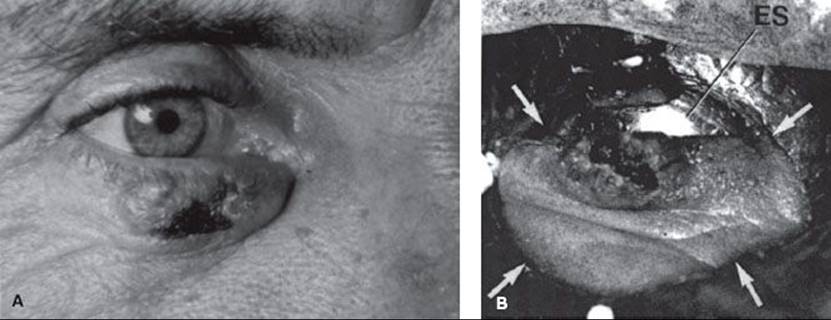 FIGURE 33.2. A: 1-cm é 1-cm basal cell carcinoma of the midportion of the lower lid. B: Treatment setup that was used to irradiate the patient. Arrows indicate the field edge. ES, eye shield.