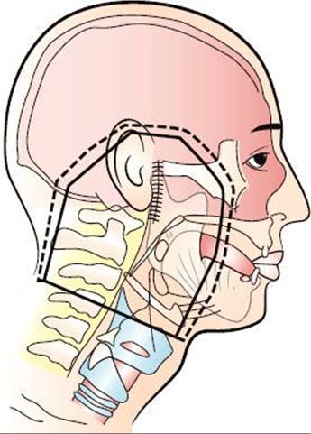 At 4,600 cGy tumor dose, the primary field is reduced off of the spinal cord, and the dose to the tumor bed is boosted with an anteriorly angled 20-MeV electron-beam field or an appositional mixed-beam field with an abutting posterior electron strip. The final dose for patients treated at 200 cGy per fraction with negative margins is 6,000 cGy; with positive margins, 6,600 cGy; and with gross residual disease, 7,000 cGy. If the dose per fraction is reduced to 180 cGy, the total dose is increased by 500 cGy. An alternative to the mixed electron–photon beam is a wedge-pair technique using 4 to 6 MV photon beams. IMRT may also be considered to reduce the dose to the temporal lobe and cerebellum, particularly if the margins are positive and/or tumor involves the deep lobe of the parotid.