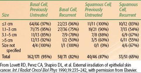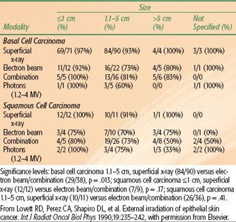 The likelihood of local control after irradiation for skin carcinomas of various sizes managed at the Mallinckrodt Institute of Radiology is outlined in Table 33.7.44 The probability of local control is higher for smaller lesions, for BCC compared with SCC, and for previously untreated lesions compared with recurrent cancers. The results of RT using various beam energies are listed in Table 33.8; treatment with orthovoltage irradiation yields local control rates that are as good as, or better than, local control rates yielded by other treatment modalities.44