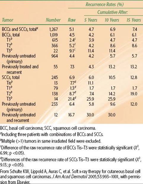TABLE 33.9 RAW AND CUMULATIVE RECURRENCE RATES OF BASAL CELL AND SQUAMOUS CELL CARCINOMAS AFTER SOFT X-RAY THERAPY