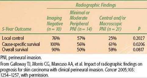 Galloway et al.48 reported on a subset of these patients and compared their outcomes with radiographic extent of PNI and found that the extent of PNI was inversely related to the likelihood of local control and survival (Table 33.12).