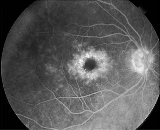 • Idiopathic macular telangiectasia type 2: May have OCT findings similar to those seen in chronic solar retinopathy, although on IVFA juxtafoveal capillary telangiectasis is seen with leakage. May be complicated by CNV.