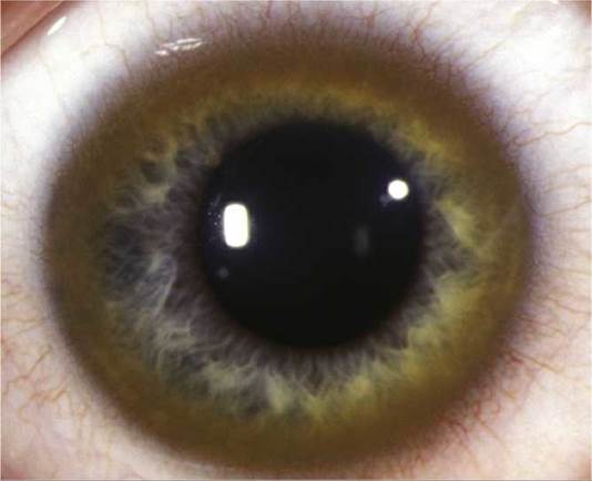 • Wilson disease: Red-brown pigment deposition in the cortex beneath the anterior capsule (a "sunflower" cataract). See 13.9, Wilson Disease.