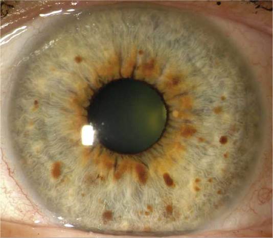 NOTE: Lisch nodules (light brown elevated lesions on darker iris or brown lesions on blue/hazel iris) occur at a rate of approximately age in years x 10% (e.g. 50% at 5 years old). Approximately 98% of affected individuals have Lisch nodules after puberty.