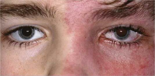 Ocular. Diffuse choroidal hemangioma (“tomato catsup” fundus with uniform reddish background obscuring choroidal vasculature), glaucoma (increased risk with upper eyelid or combined upper and lower eyelid port-wine birthmark or choroidal hemangioma), iris heterochromia, blood in Schlemm canal seen on gonioscopy, and secondary serous retinal detachment. Ocular signs are all ipsilateral to port-wine birthmark.
