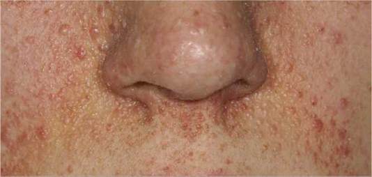 Systemic. Adenoma sebaceum (yellow-red angiofibromas in a butterfly distribution on the upper cheeks), seizures, periventricular hamartomas, developmental delay, subungual angiofibromas, shagreen patches, ash leaf spots (hypopigmented skin lesions that illuminate with Wood lamp); renal cell carcinoma or angiomyolipoma; intracardiac rhabdomyoma or lipoma; pleural cysts and possible spontaneous pneumothorax; cystic bone lesions; and hamartomas of the liver, thyroid, pancreas, or testes.