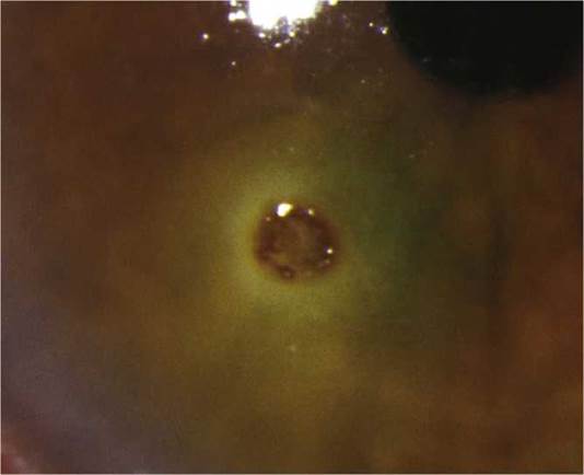 FIGURE 3.3.1 Corneal metallic foreign body with rust ring.